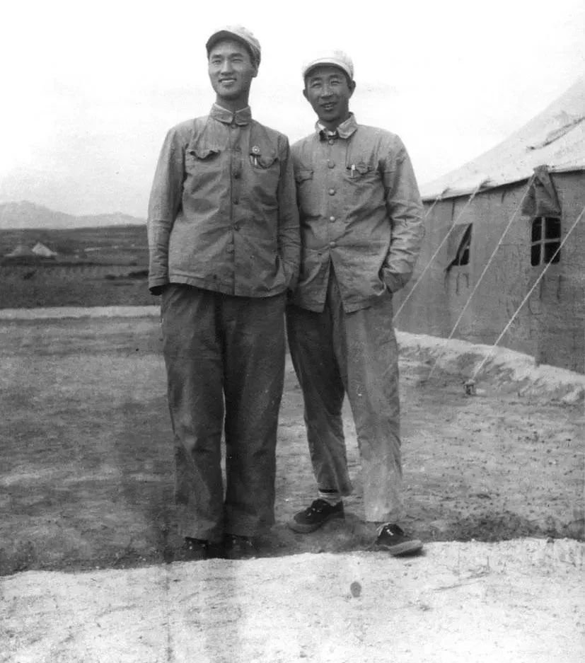 1951年夏新华社记者阎吾(右)、李耐因在开城停战谈判会场帐篷外留影。