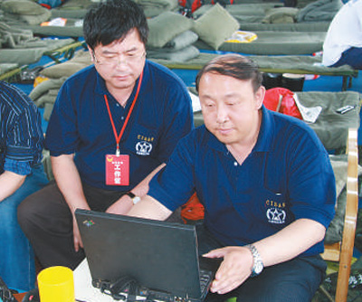 孙柏涛(右)和科考队员一起在整理地震灾害资料。中国地震局工程力学研究所供图