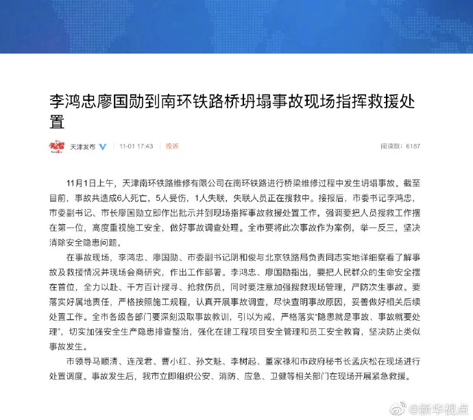 11月1日上午,天津南环铁路维修有限公司在南环铁路进行桥梁维修过程中发生坍塌事故。截至目前,事故共造成6人死亡,5人受伤,1人失联,失联人员正在搜救中。