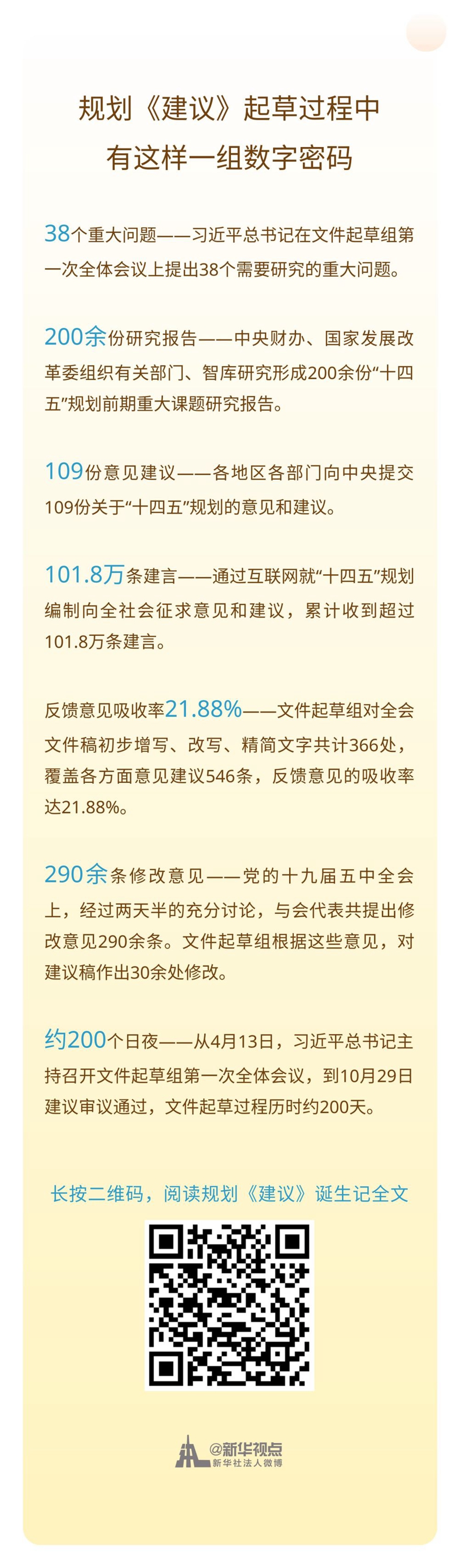 新华社4日播发了规划《建议》诞生记,这篇万字长文中,披露了规划《建议》起草过程中的一组数字密码。