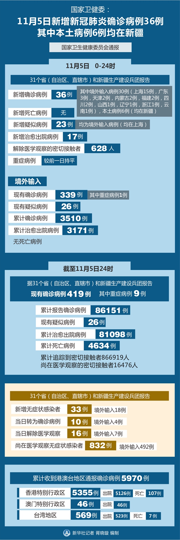 新华社北京11月6日电 国家卫生健康委员会6日通报,11月5日0-24时,31个省(自治区、直辖市)和新疆生产建设兵团报告新增新冠肺炎确诊病例36例,其中境外输入病例30例(上海15例,广东3例,天津2例,内蒙古2例,福建2例,四川2例,山西1例,辽宁1例,浙江1例,云南1例),本土病例6例(均在新疆);无新增死亡病例;新增疑似病例23例,均为境外输入病例(均在上海)。