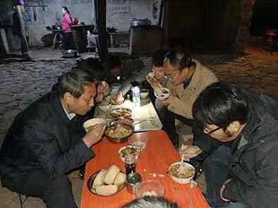 ▲寻找小组返回半山腰天色已黑,在农户家吃晚饭。新华社记者徐伟摄。