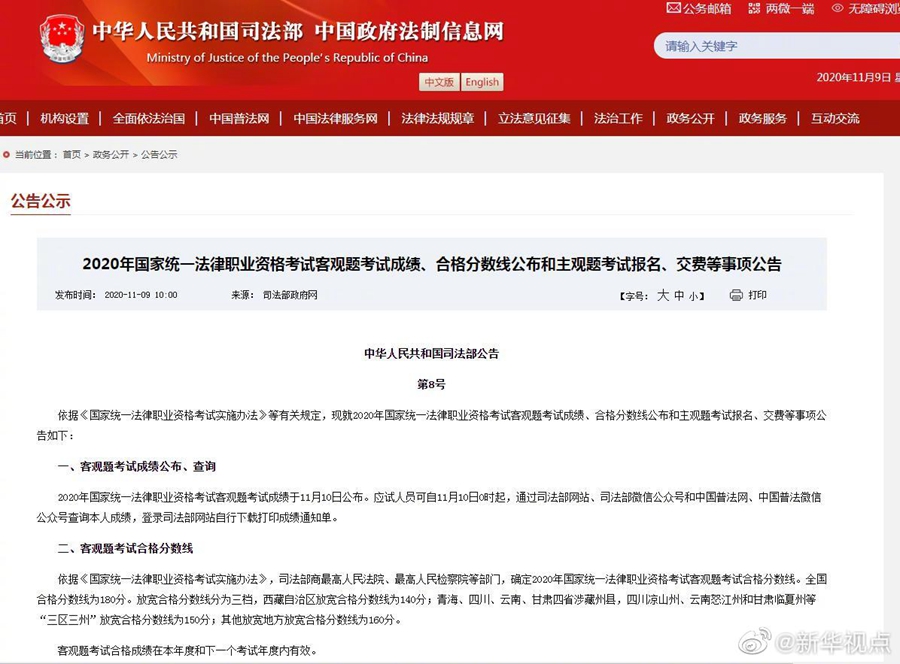记者9日从司法部获悉,2020年国家统一法律职业资格考试客观题考试成绩将于11月10日公布,全国合格分数线为180分。自11月10日0时起,应试人员可通过司法部网站、司法部微信公众号和中国普法网、中国普法微信公众号查询成绩,登录司法部网站自行下载打印成绩通知单。通过2020年客观题考试的应试人员和2019年客观题考试保留有效成绩人员,应于11月10日0时至11月14日24时,登录司法部网站报名确认参加主观题考试。(记者白阳)