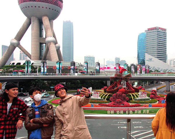 11月1日,游客在上海浦东陆家嘴环岛的天桥上拍照 陈飞摄