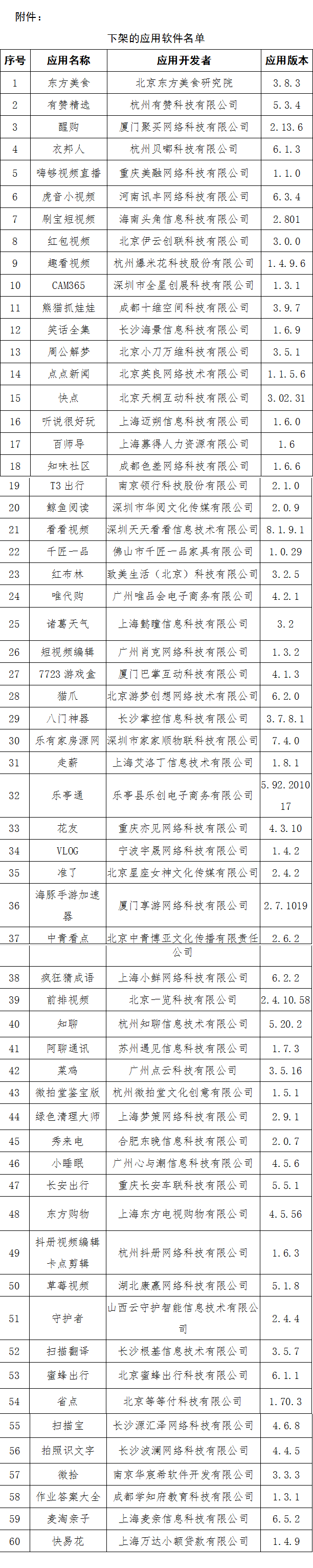 新华社北京11月10日电(记者张辛欣)工信部10日通报,截至目前,经第三方检测机构核查复检,有赞精选、红布林等60款App存在侵害用户权益行为且未按照要求完成整改。依据有关法律和规范性文件要求,工信部组织对上述App进行下架。