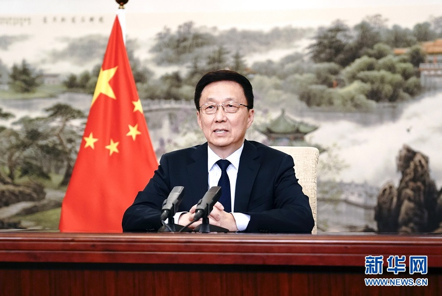 11月10日,博鳌亚洲论坛国际科技与创新论坛首届大会开幕式在澳门举行。中共中央政治局常委、国务院副总理韩正以视频方式发表主旨演讲。 新华社记者 丁林 摄