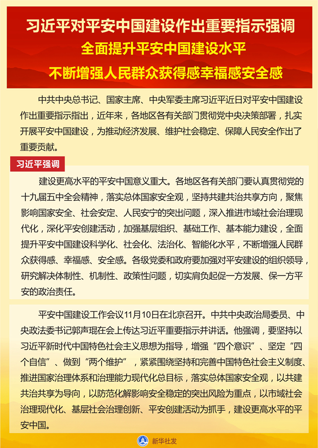 新华社北京11月11日电 中共中央总书记、国家主席、中央军委主席习近平近日对平安中国建设作出重要指示指出,近年来,各地区各有关部门贯彻党中央决策部署,扎实开展平安中国建设,为推动经济发展、维护社会稳定、保障人民安全作出了重要贡献。