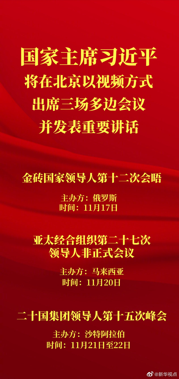 外交部发言人华春莹12日宣布:应俄罗斯联邦总统普京邀请,国家主席习近平将于11月17日出席金砖国家领导人第十二次会晤。应马来西亚总理穆希丁邀请,国家主席习近平将于11月20日出席亚太经合组织第二十七次领导人非正式会议。应沙特阿拉伯王国国王萨勒曼邀请,国家主席习近平将出席11月21日至22日举行的二十国集团领导人第十五次峰会。上述会议将以视频方式举行,习近平主席将在北京出席有关活动并发表重要讲话。