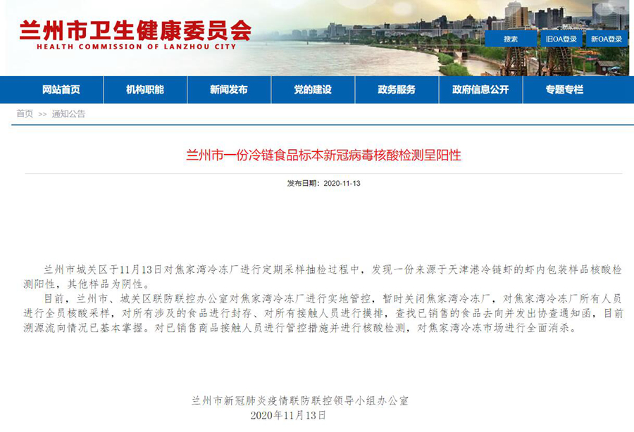 兰州市城关区于11月13日对焦家湾冷冻厂进行定期采样抽检过程中,发现一份来源于天津港冷链虾的虾内包装样品核酸检测阳性,其他样品为阴性。