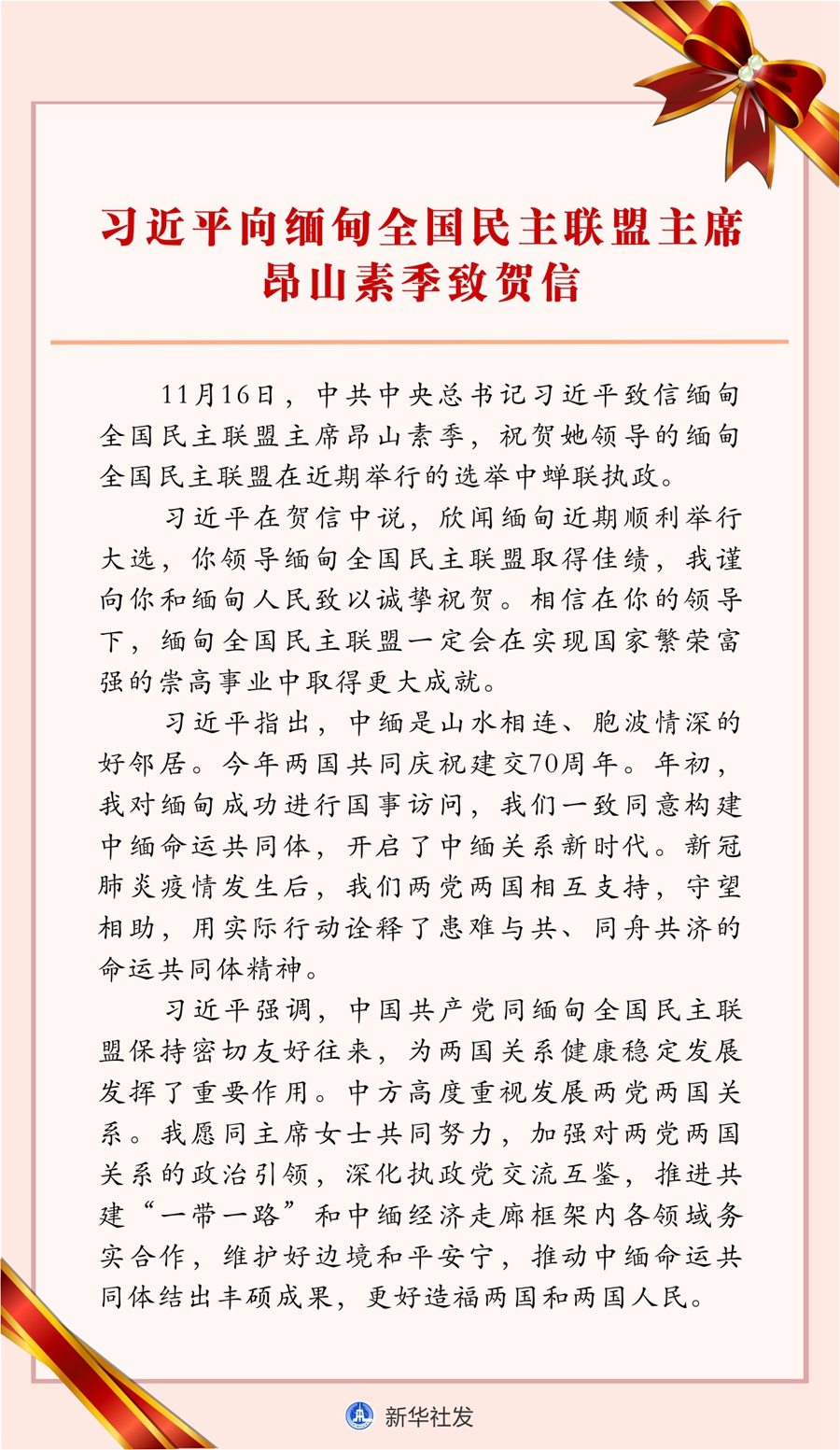 新华社北京11月17日电 11月16日,中共中央总书记习近平致信缅甸全国民主联盟主席昂山素季,祝贺她领导的缅甸全国民主联盟在近期举行的选举中蝉联执政。