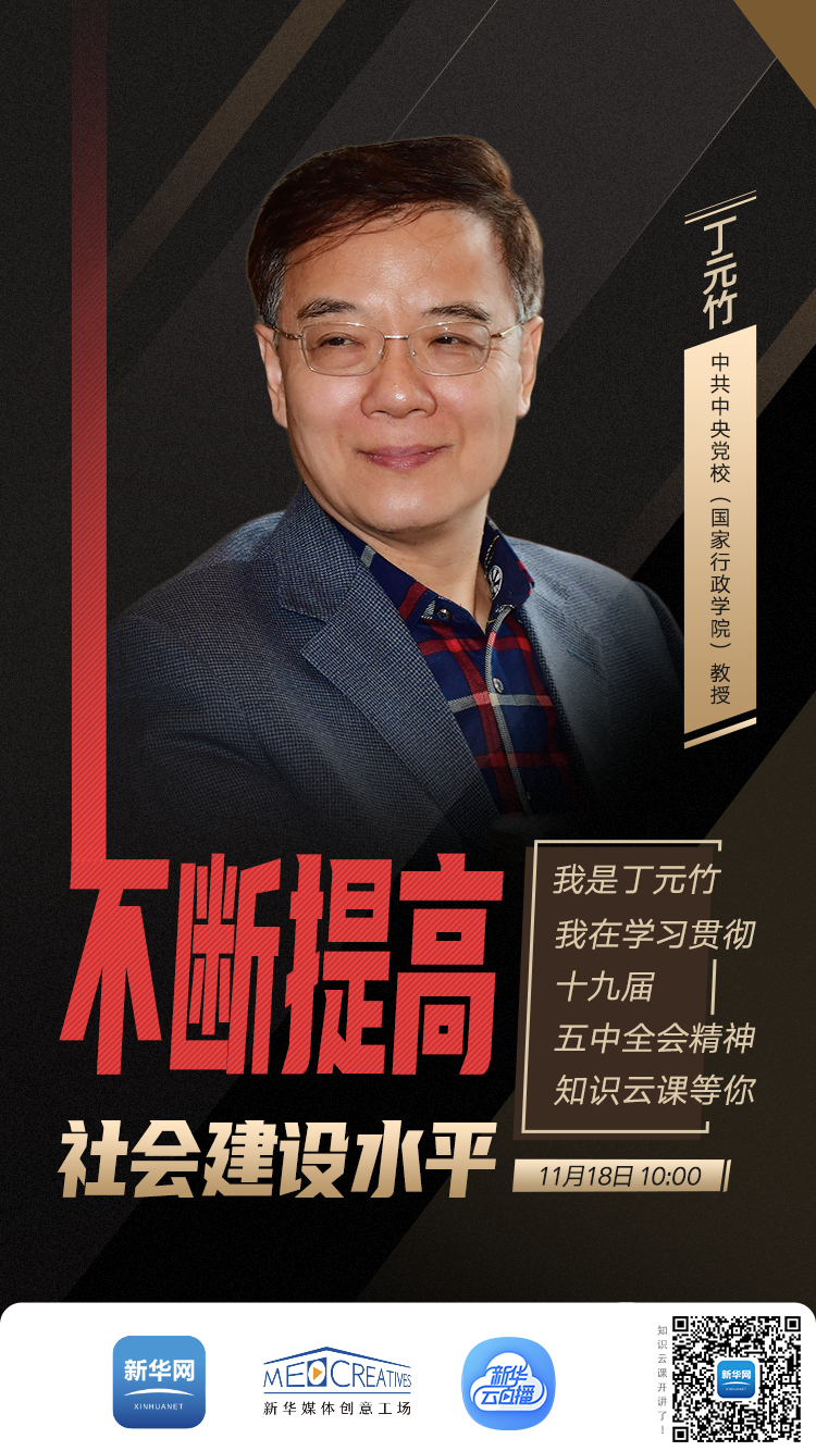 为深入学习贯彻党的十九届五中全会精神,读懂未来中国发展的重要信号,由中央网信办网络新闻信息传播局指导,新华网倾力打造《学习贯彻十九届五中全会精神知识云课》系列网络视频云课。11月18日上午10点,《知识云课》将开启第二讲,邀请中共中央党校(国家行政学院)督学、社会和生态文明教研部教授、博导;十三届全国政协委员、全国政协文化文史和学习委员会委员丁元竹,紧扣五中全会精神要义,结合自身研究领域,以《努力提高社会建设水平》为主题,解读“十四五”时期改善人民生活品质,提高社会建设水平的学习体会。