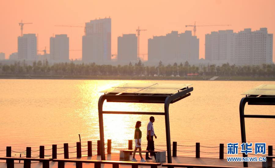 市民在驻马店市新蔡县东湖景观大道休闲(2019年6月13日摄)。新华社发