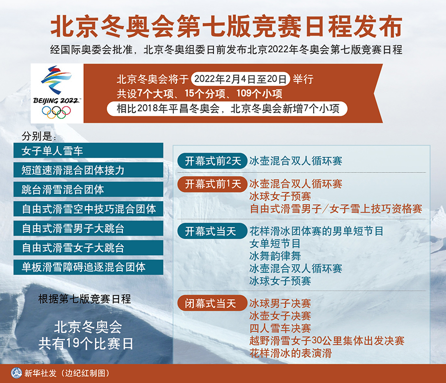 新华社北京11月18日电(记者姬烨、王梦、汪涌)经国际奥委会批准,北京冬奥组委日前发布北京2022年冬奥会第七版竞赛日程。随着筹备工作的深入,北京冬奥会竞赛日程仍可能调整。