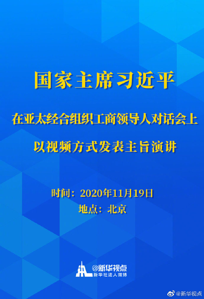 国家主席习近平11月19日在北京以视频方式在亚太经合组织工商领导人对话会上发表主旨演讲