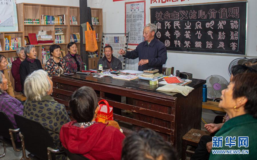 11月17日晚,大陈村村民聚在村图书室一同唱歌。大陈村每周在图书室组织三次歌唱活动,歌曲以自编的村歌为主。新华社发(江汉 摄)