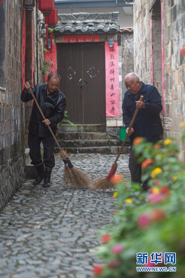 11月17日,大陈村村民汪须仓(左)、汪岩宣义务打扫村内的石板路。从2005年起,大陈村号召村民“美村必先洁家”,义务打扫也逐渐成为大家的一种习惯。新华社发(江汉 摄)