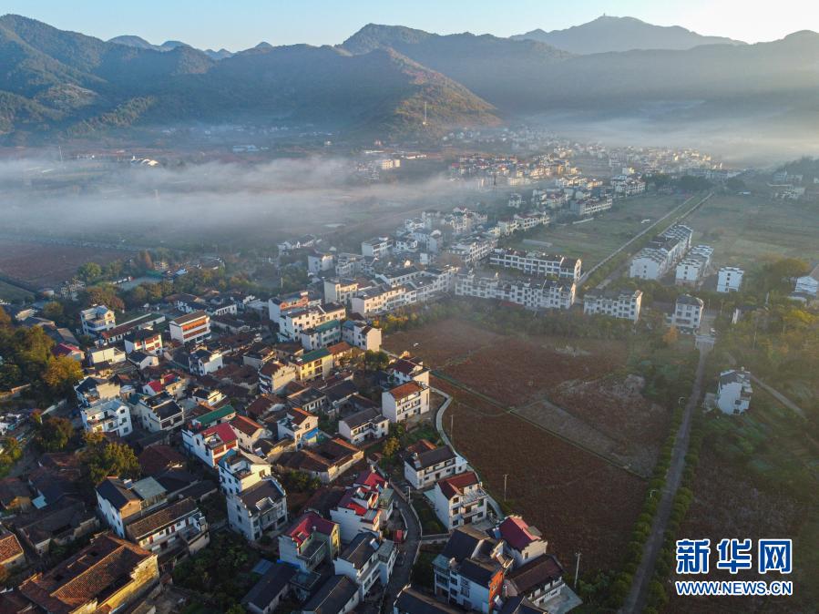 这是11月18日拍摄的沐浴在晨光中的大陈村(无人机照片)。新华社发(江汉 摄)