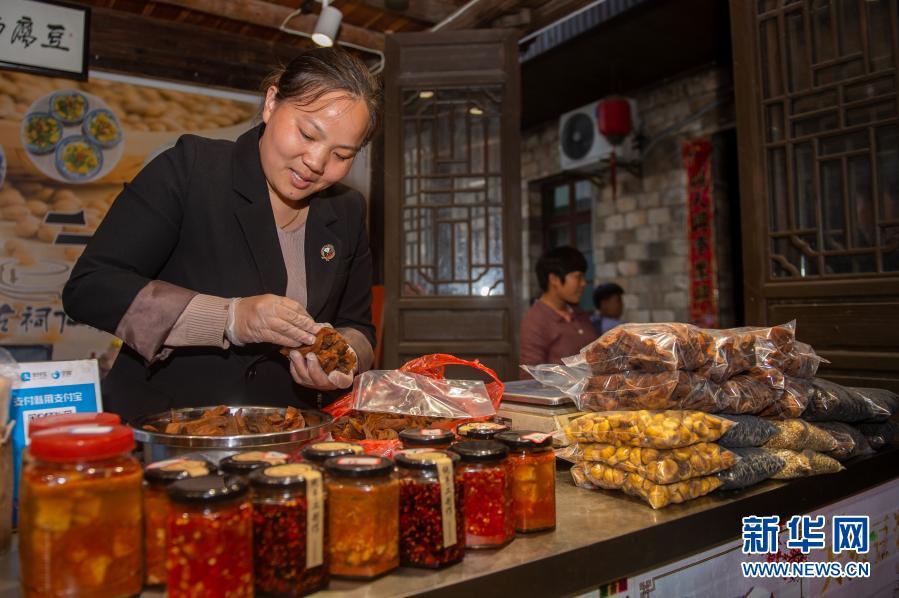 11月17日,大陈村村民汪晓玲在自家经营的土特产店内整理新鲜出炉的地瓜干供游客挑选。新华社发(江汉 摄)