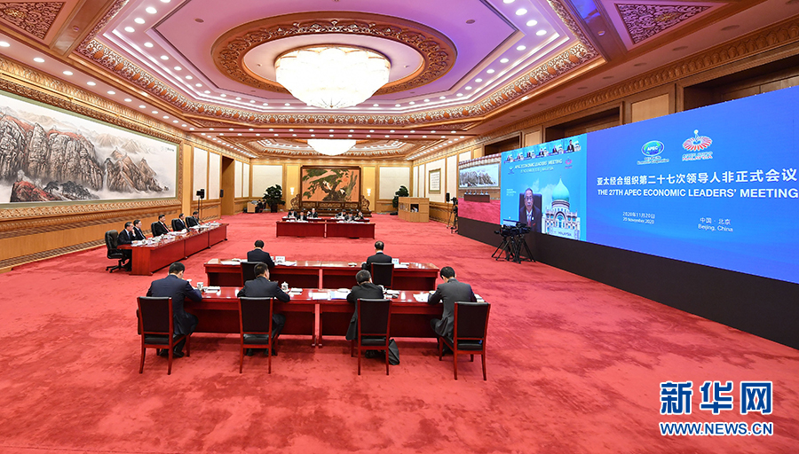 11月20日晚,国家主席习近平在北京以视频方式出席亚太经合组织第二十七次领导人非正式会议并发表重要讲话。 新华社记者 王晔 摄