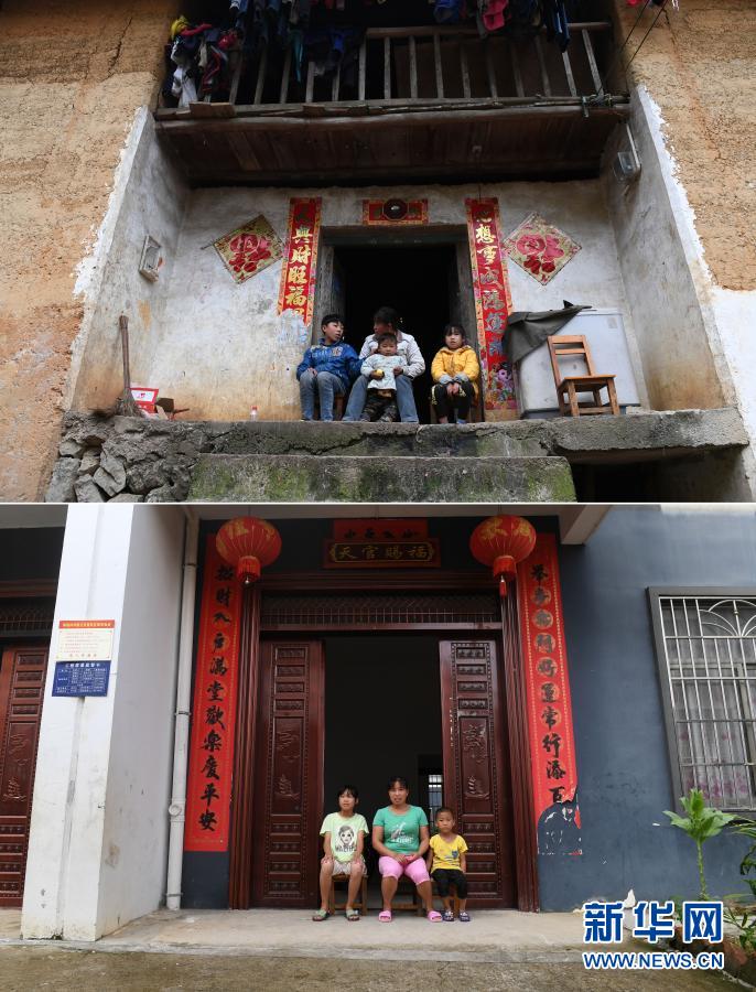 这是一张拼版照片。上图:在广西都安瑶族自治县下坳镇加八村,白雨璐(右一)和家人坐在家门口(2017年2月9日摄);下图:在下坳镇车家庄扶贫搬迁安置新区,白雨璐(左一)和家人坐在家门口(8月18日摄)。新华社记者 陆波岸 摄