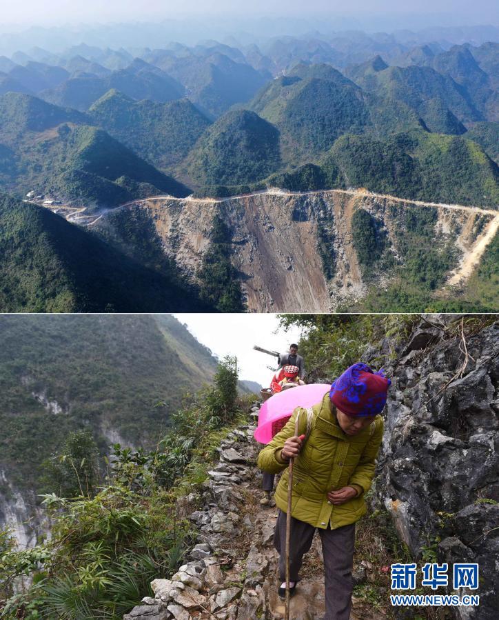 这是一张拼版照片。上图:已经修通水泥路的大化瑶族自治县板升乡八好村(2019年11月11日摄,无人机照片);下图:在尚未通路前,八好村村民背着年货走山路回家(2016年1月26日摄)。新华社记者 黄孝邦 摄