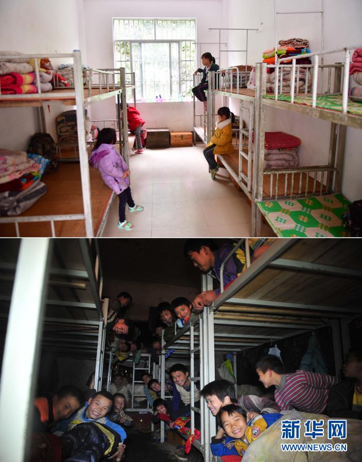 这是一张拼版照片。上图:在大化瑶族自治县板升乡弄勇小学,同学们在新宿舍里(2019年5月8日摄);下图: 2012年12月26日,在弄勇小学,同学们挤在10多平方米的“大通铺”上准备睡觉。新华社记者 黄孝邦 摄