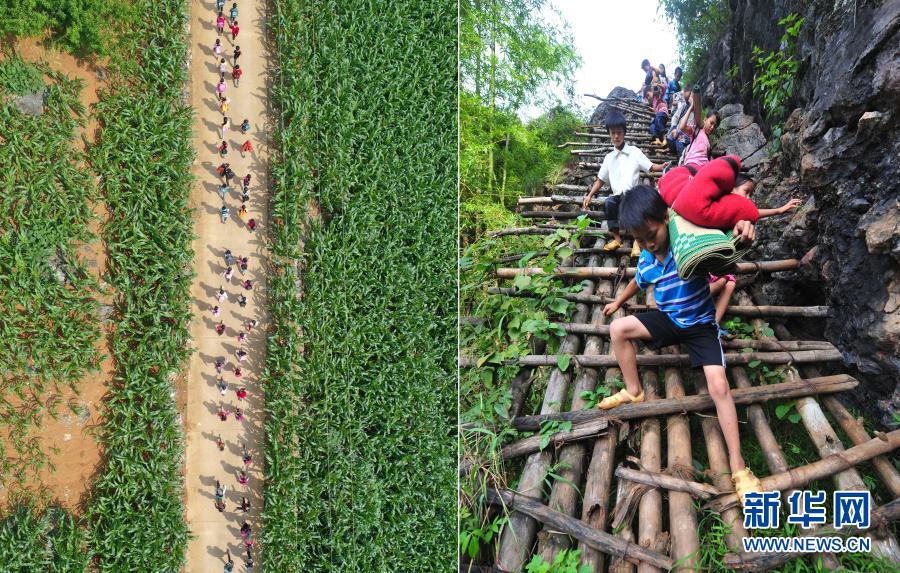 这是一张拼版照片。左图:在大化瑶族自治县板升乡弄勇村,孩子们走在放学路上(2019年5月10日摄,无人机照片);右图:在弄勇村弄顶屯,孩子们扛着生活用具,爬悬梯上学(2012年9月3日摄)。目前,弄勇村所有的屯都已告别没有公路的历史。新华社记者 黄孝邦 摄