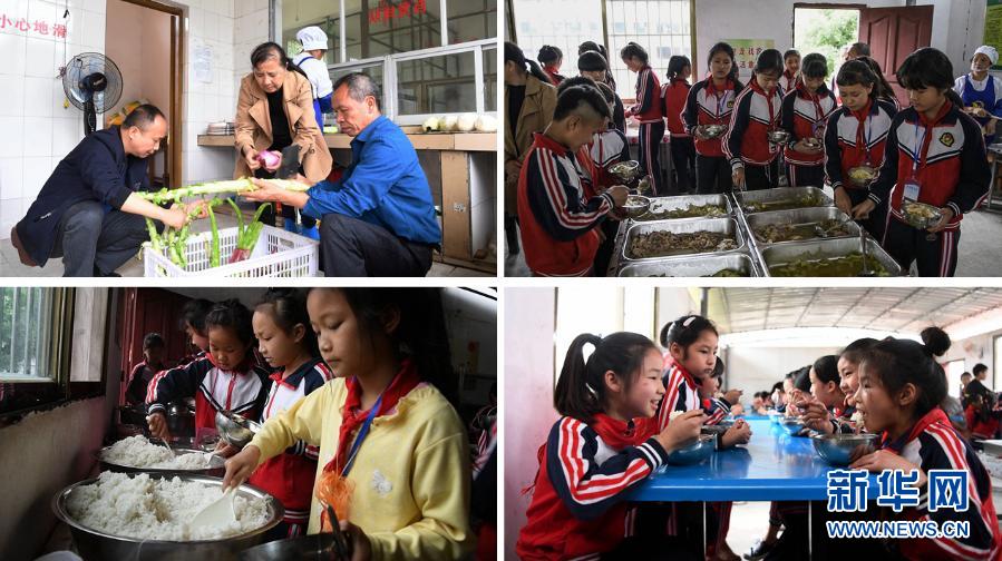 这是一张拼版照片。上左:在融水苗族自治县东阳村小学,厨房师傅们在准备营养午餐;上右:东阳村小学学生根据需要挑选菜肴。下左:东阳村小学学生排队打饭;下右:东阳村小学学生在食用营养午餐。近年来,广西在贫困地区大力推行学生营养餐,帮助贫困学生健康成长(2019年5月6日摄)。新华社记者 张爱林 摄