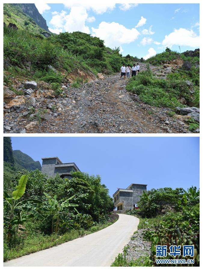 这是一张拼版照片:上图:广西那坡县边境零公里线上甲柳村上保屯的进屯路(2009年7月14日摄);下图:甲柳村上保屯现在的道路(2018年6月7日摄)。新华社记者 张爱林 摄