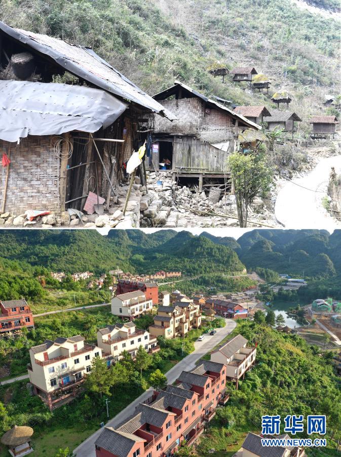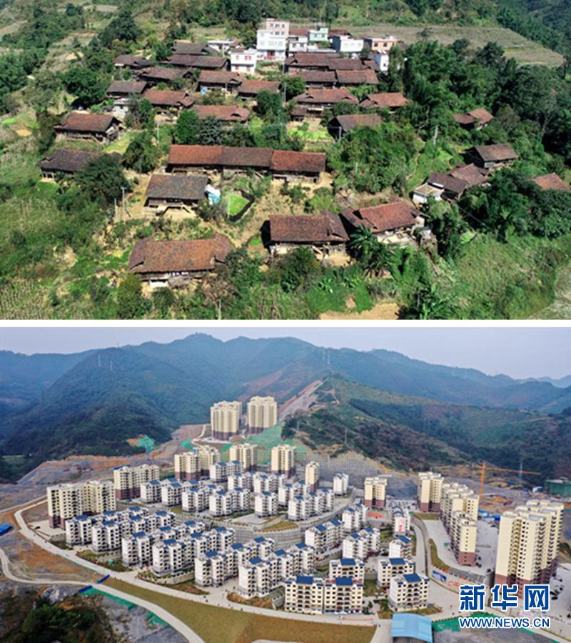 这是一张拼版照片。上图:广西百色市隆林各族自治县金钟山乡平流村坡安屯群众搬迁前的住房(2017年7月21日摄,无人机照片);下图:平流村坡安屯群众搬迁到安置点的新住房(2019年12月3日摄)。新华社记者 张爱林 摄