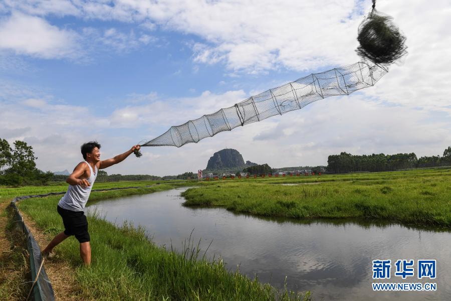 在广西武宣县禄新镇上堂村稻虾轮作养殖示范基地,村民将捕虾笼抛入虾塘中(6月17日摄)。新华社记者 曹祎铭 摄