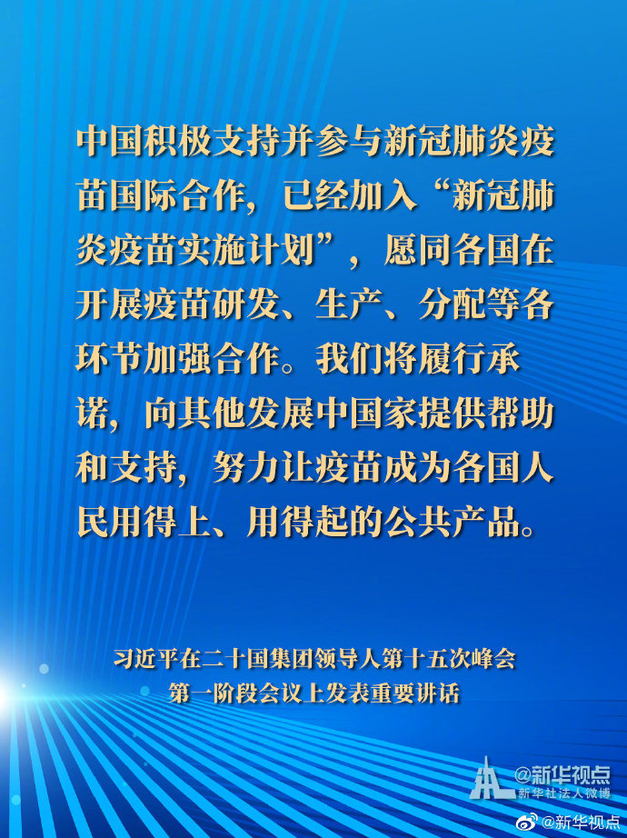 国家主席习近平21日晚在北京以视频方式出席二十国集团领导人第十五次峰会第一阶段会议并发表重要讲话。以下是讲话要点。