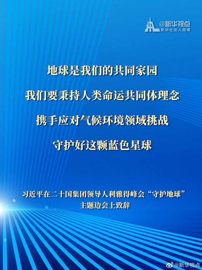 国家主席习近平11月22日在二十国集团领导人利雅得峰会“守护地球”主题边会上致辞时表示,地球是我们的共同家园。我们要秉持人类命运共同体理念,携手应对气候环境领域挑战,守护好这颗蓝色星球。