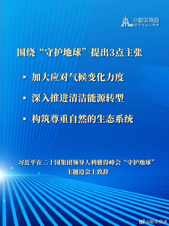 国家主席习近平11月22日在二十国集团领导人利雅得峰会“守护地球”主题边会上提出3点主张。