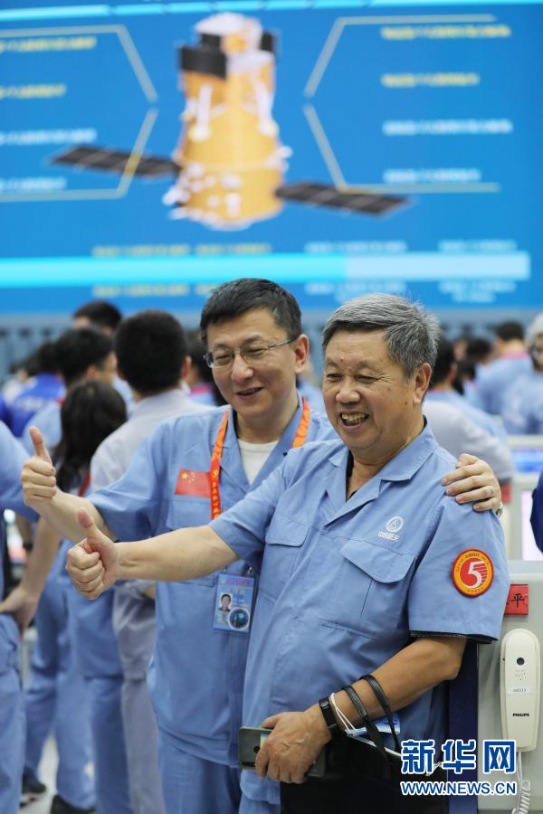 11月24日4时30分,我国在中国文昌航天发射场,用长征五号遥五运载火箭成功发射探月工程嫦娥五号探测器,火箭飞行约2200秒后,顺利将探测器送入预定轨道,开启我国首次地外天体采样返回之旅。这是航天科技人员在文昌航天发射场庆祝发射成功。新华社记者金立旺摄