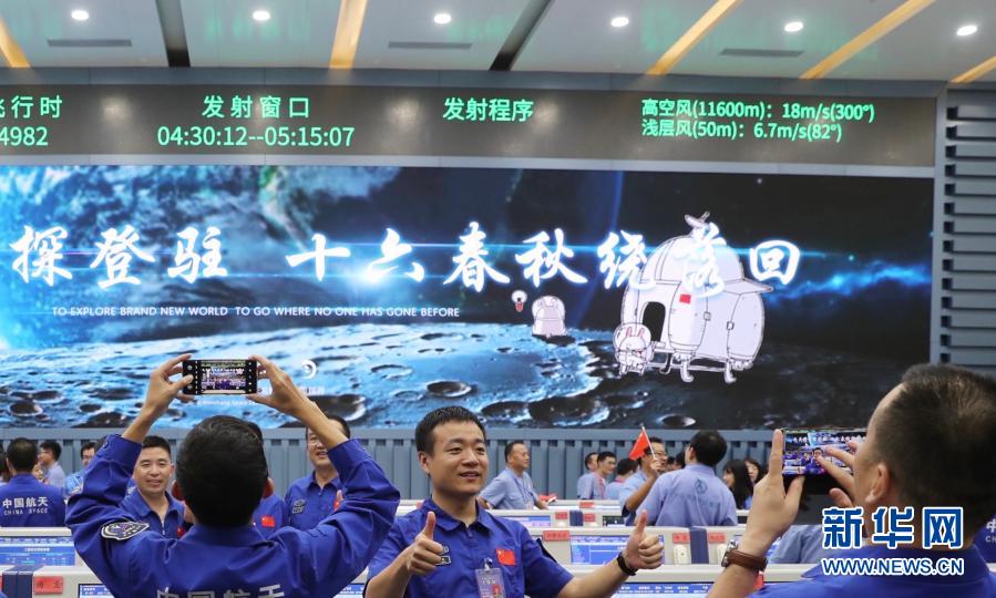 11月24日4时30分,我国在中国文昌航天发射场,用长征五号遥五运载火箭成功发射探月工程嫦娥五号探测器,火箭飞行约2200秒后,顺利将探测器送入预定轨道,开启我国首次地外天体采样返回之旅。这是航天科技人员在文昌航天发射场庆祝发射成功。新华社记者金立旺摄