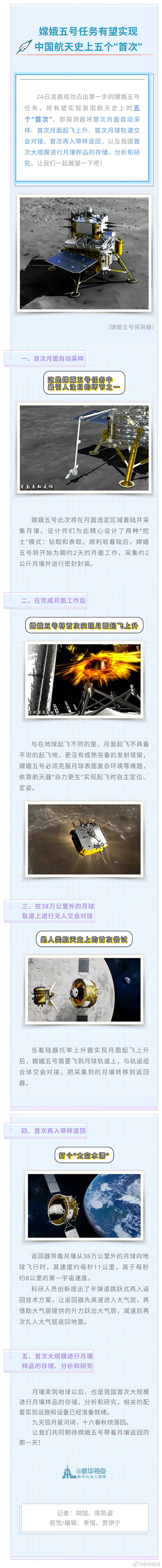 24日凌晨成功迈出第一步的嫦娥五号任务,将有望实现我国航天史上的五个“首次”。看详情!一起来展望⬇