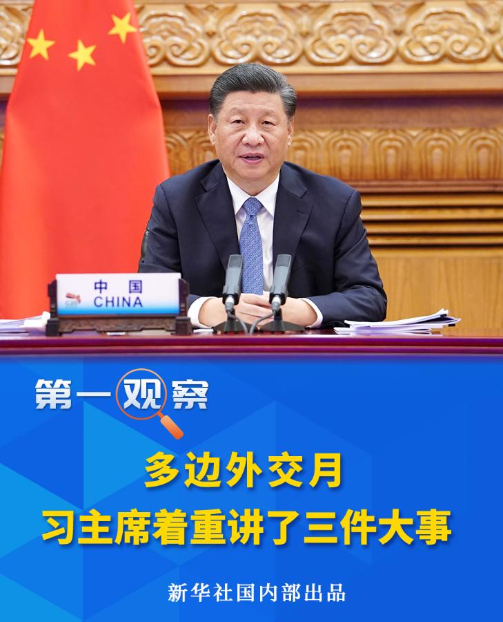 继9月底10月初出席联合国成立75周年系列活动,11月10日至22日,习近平主席又以视频方式接连出席了上合、金砖、APEC、G20四大多边平台的一系列重大外交活动。
