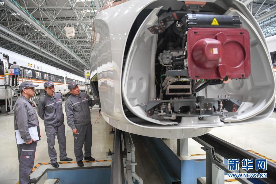 11月25日,在中车长春轨道客车股份有限公司高速动车组制造中心调试车间,罗昭强(右一)与同事检查复兴号高铁列车的电气系统。新华社记者 张楠 摄