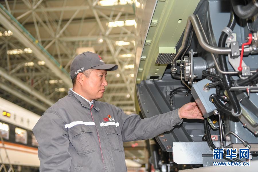11月25日,在中车长春轨道客车股份有限公司高速动车组制造中心调试车间,罗昭强检查复兴号高铁列车装置的工作情况。新华社记者 张楠 摄