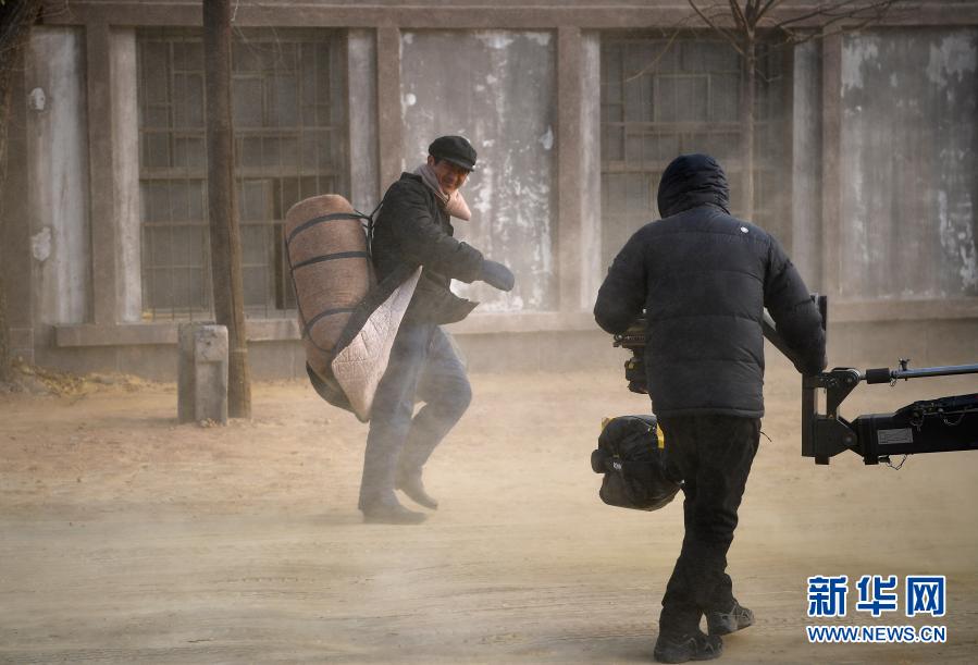 11月25日,焦裕禄扮演者郭晓东(左)在片场拍摄。新华社记者 王鹏 摄