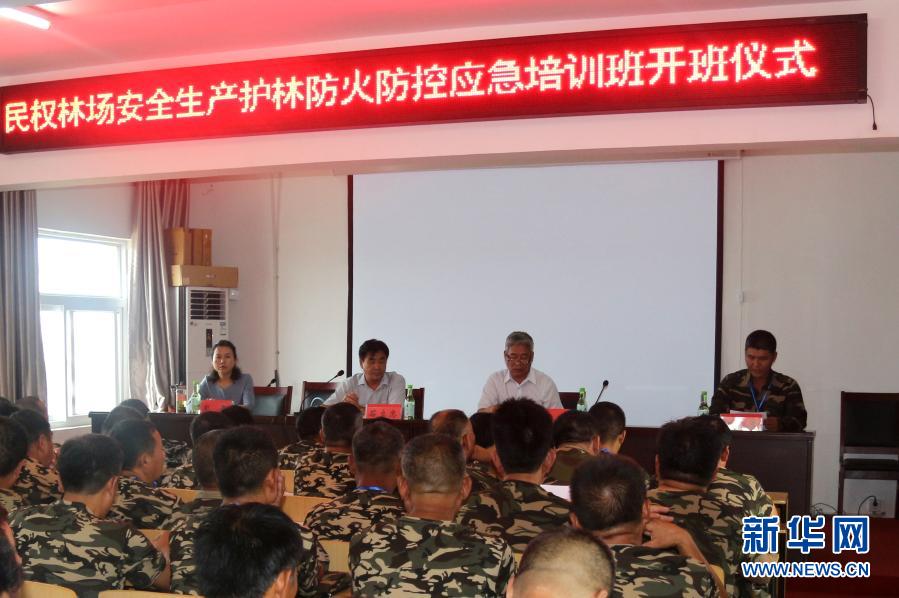 石立忠(台上左二)和翟文杰(台上右一)在民权林场安全生产护林防火防控应急培训班开班仪式上(资料照片)。新华社发