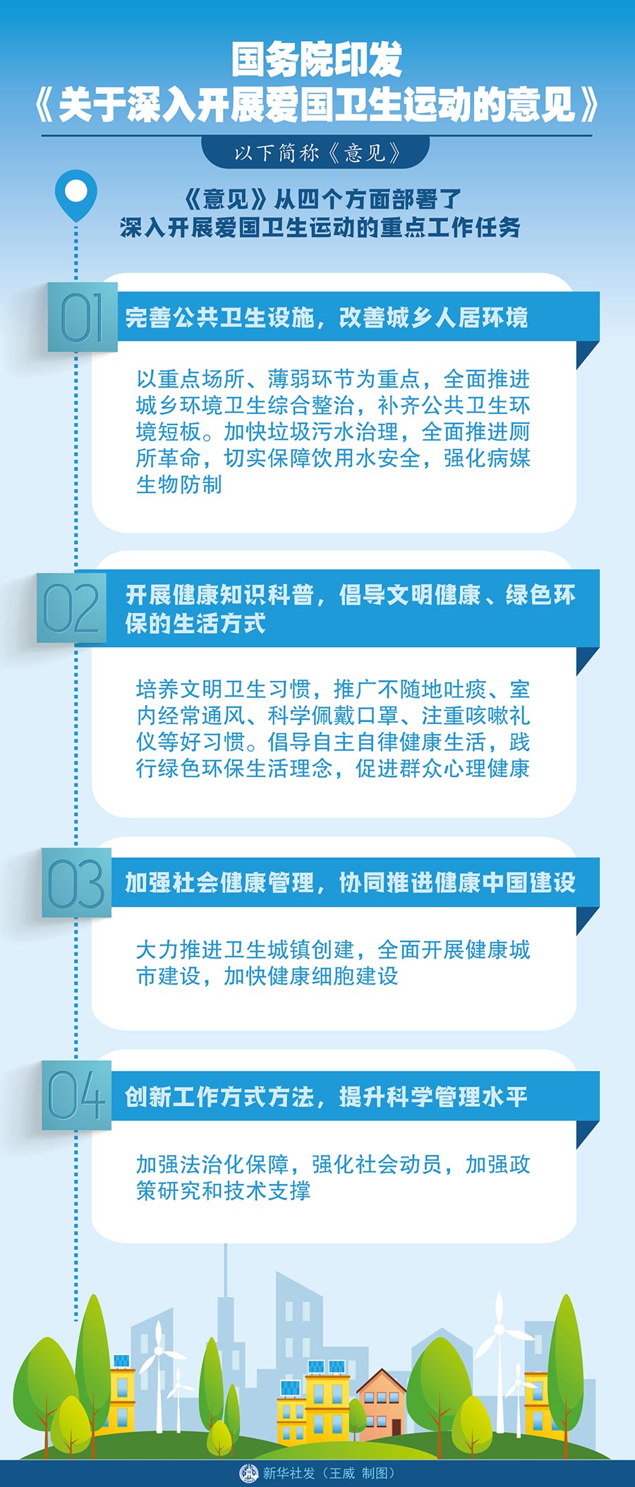 《意见》从四个方面部署了深入开展爱国卫生运动的重点工作任务。一是完善公共卫生设施,改善城乡人居环境。以重点场所、薄弱环节为重点,全面推进城乡环境卫生综合整治,补齐公共卫生环境短板。加快垃圾污水治理,全面推进厕所革命,切实保障饮用水安全,强化病媒生物防制。二是开展健康知识科普,倡导文明健康、绿色环保的生活方式。培养文明卫生习惯,推广不随地吐痰、室内经常通风、科学佩戴口罩、注重咳嗽礼仪等好习惯。倡导自主自律健康生活,践行绿色环保生活理念,促进群众心理健康。三是加强社会健康管理,协同推进健康中国建设。大力推进卫生城镇创建,全面开展健康城市建设,加快健康细胞建设。四是创新工作方式方法,提升科学管理水平。加强法治化保障,强化社会动员,加强政策研究和技术支撑。