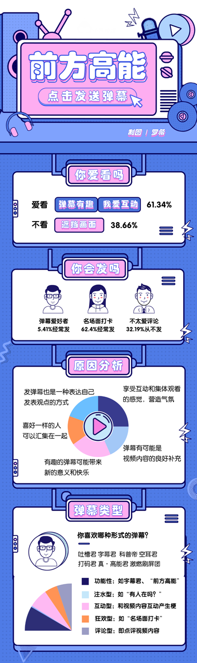中青校媒调查显示,受访大学生对不同类型的“弹幕君”喜好程度不一,其中“科普帝”以59.66%位列排行榜第一,“真·高能君”占52.77%,“字幕君”占52%,之后依次是“吐槽君”“激燃刷屏团”“空耳君”“打码君”,分别占42.7%、19.06%、12.13%和7.86%。