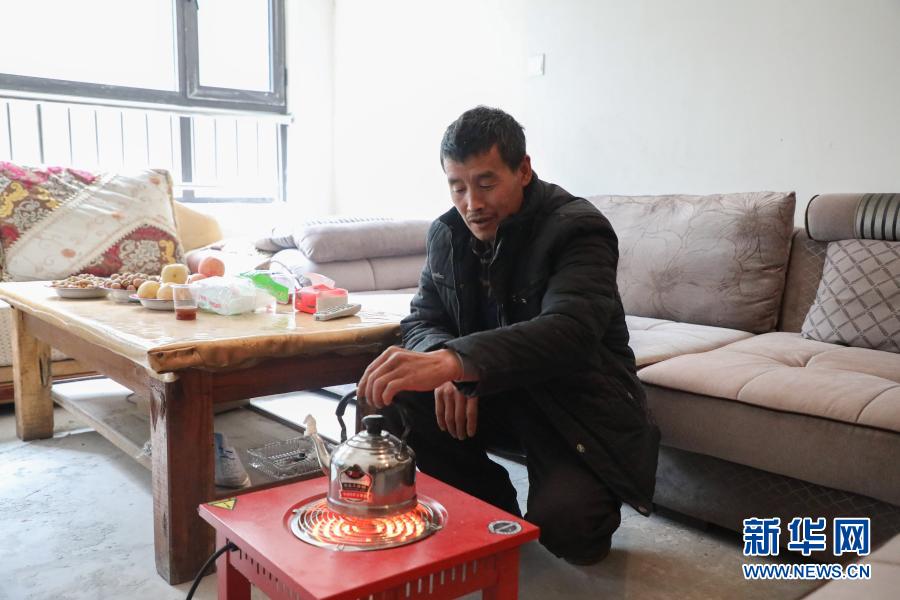 12月2日,在舟曲县曲告纳镇田园生态小区易地扶贫搬迁集中安置点,曲告纳镇茶坪村扎尕组村民在临时安置的房屋内煮茶。