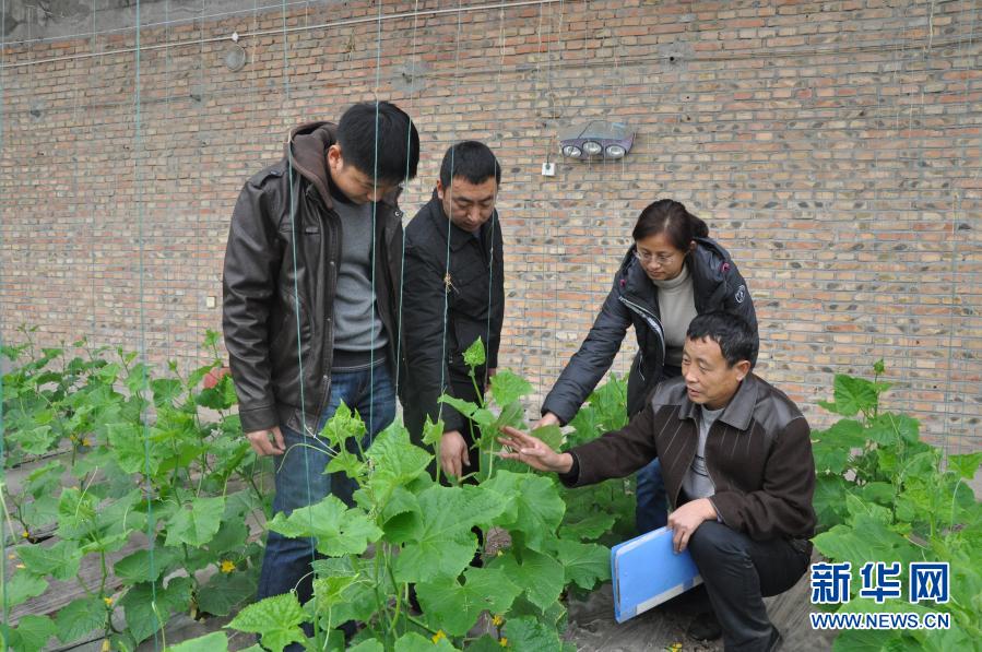 李加旺(右一)与课题组成员一起观察黄瓜植株的生长情况(2014年11月27日摄)。新华社发(天津科润黄瓜研究所供图)