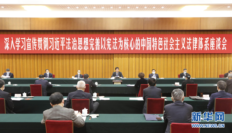 今年12月4日是第七个国家宪法日,全国人大常委会办公厅会同中央宣传部、司法部在京召开“深入学习宣传贯彻习近平法治思想,完善以宪法为核心的中国特色社会主义法律体系”座谈会。中共中央政治局常委、全国人大常委会委员长栗战书出席座谈会并讲话。新华社记者 刘卫兵 摄