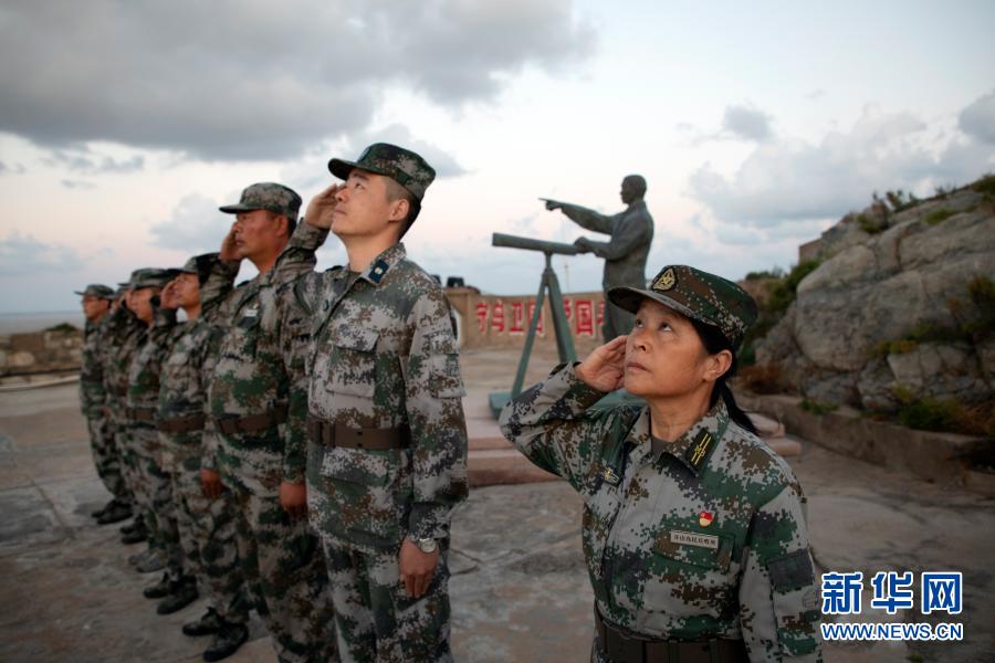 在江苏省灌云县开山岛,王仕花(右一)和轮值民兵一起向国旗敬礼(9月27日摄)。新华社记者 刘芳 摄