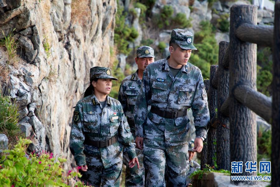 在江苏省灌云县开山岛,王仕花(左)、民兵哨所所长陈志显(右)和轮值民兵一起巡逻(9月27日摄)。新华社记者 刘芳 摄