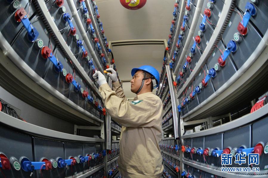 在江苏省灌云县开山岛,国家电网的施工人员在调试“风光储互补智能微电网系统”的蓄电池组(2019年6月18日摄)。新华社发(万程鹏 摄)
